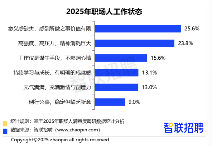 但调研数据也显示,2025年,身心健康状况成为职场人生活质量的短板。睡眠问题高居健康困扰首位,42.3%的职场人受失眠或睡眠质量差影响,颈椎腰椎酸痛(39%)、视力模糊干涩(38.3%)等职业病也较为普遍。31.5%的职场人每日工作超10小时,38.4%全年未休年假,“久坐缺乏运动”以71.2%的占比成为公认的健康头号杀手。心理层面同样承压,54.9%的职场人受焦虑烦躁困扰,职业发展焦虑与工作氛围压抑是主要压力源。