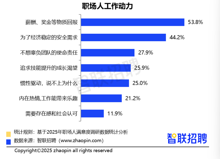 工资是每一个职场人最关心的事。2025年驱动职场人每日投入工作的核心动力是物质回报和安全需求。第一驱动力“物质回报”以53.8%的绝对占比高居榜首,在2025年,有24.1%的职场人成功实现涨薪。薪酬之外,福利也是人才竞争的第二战场,2025年“绩效奖金/年终奖”以72.6%的压倒性需求成为最核心的福利期待,“超额的带薪年假与弹性休假制度”以48.4%的高占比紧随其后,成为对抗“996”、追求“时间主权”的宣言;“补充医疗保险(含家人)及健康管理”(37.4%)需求旺盛,说明职场人的健康意识全面觉醒,职场人重视企业对员工的健康支持。